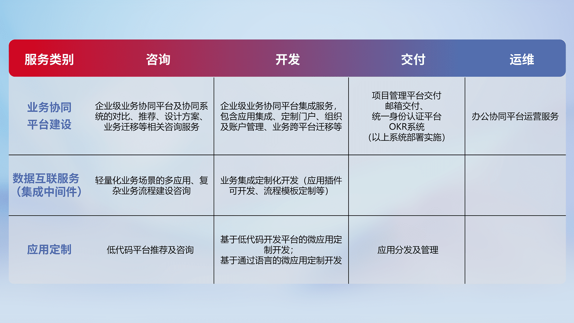 针对钉钉、、企微、、、IDaas等平台级产品提供产品的规划、、方案、、交付、、定制化开发等服务,,,实现如统一协同办公、、、、智能客户服务、、混合会议管理、、、、智能数据查询、、、等业务场景,,,实现数字化转型。。。